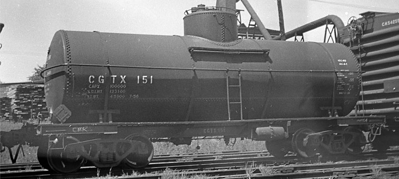 CGTX's 101-series cars consisted of three groups of cars, apparently acquired used from 1955 through 1961. Photographs of this series show differing types of cars, all of 10,000 gal. nominal capacity. The first group was 68 cars acquired in late 1955 as 101-168, and are believed to be former McColl-Frontenac cars. Cars 106-110 were listed as being insulated by the mid-1960s, and appear to have remained that way for the remainder of their service. The second group was 28? cars acquired in early 1961 as 169-196 (however, it should be noted that only 22 cars actually appeared in listings at this time, so some of these numbers may have been vacant). By 10/1961 the series had been extended by two additional cars, CGTX 197-198, and given the closeness of their addition, may simply have been stragglers from the second group. It would appear that 199 was vacant. By early 1978, all of these later cars were off the roster.