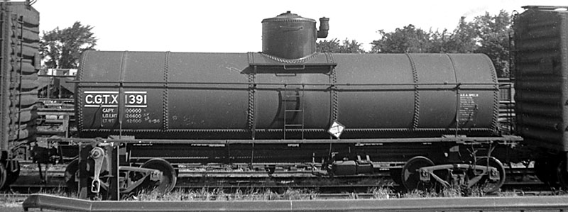 CGTX's 1000 series consisted of a mixture of 10,000 and 12,000 gallon tank cars, and were a mixture of new and used cars acquired from 1932 to 1952. The first series arrived in 3/1932 lettered for the Canadian Tank Car Co. with CATX reporting marks. By 5/1932 the company name had been changed, although cars with CATX reporting marks continued to be listed through the 7/1933 ORER (by 7/1934 the CATX reporting mark was gone). Two additional series arrived from CC&F: 1026-1050 in 8/1932 (although ORERs would not report these cars until 7/1934), and 1051-1100 in 9/1942, for a total of 100 cars. It also appears that cars 1111-1160 were also constructed new in 1942, which would bring the total to 150 cars. In 1942, used cars began to be acquired as part of this group with the arrival of 1101-1110. This particular series had a short life on CGTX, disappearing from the roster during 1947-48.